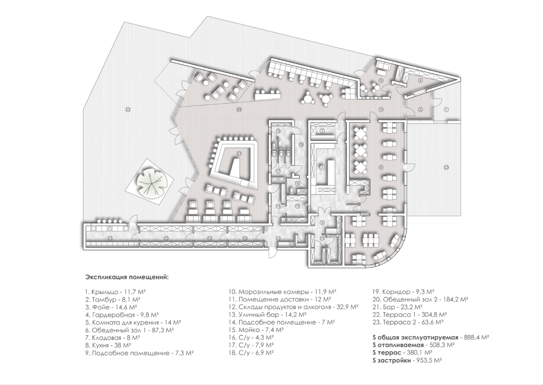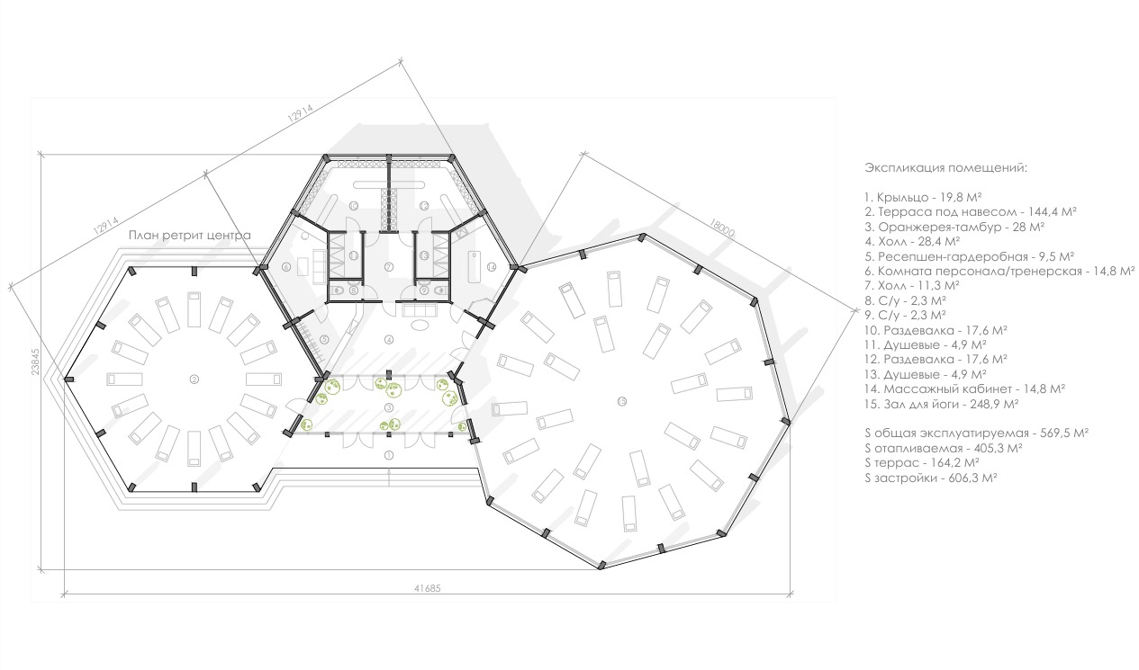 - Оранжерея-тамбур, массажный зал, зал для йоги, раздевалки, душевые, терраса, с/у